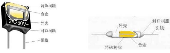 結構:溫度保險絲結構分為方殼型和瓷管型兩種,其工作原理是相同的。 如圖所示,溫度保險絲結構包括感溫合金,它連接在兩引腳上,表面包覆特殊樹脂,插入到陶瓷管或塑料外殼內,再用環(huán)氧樹脂封裝。