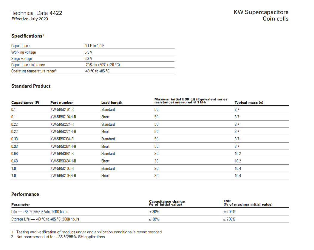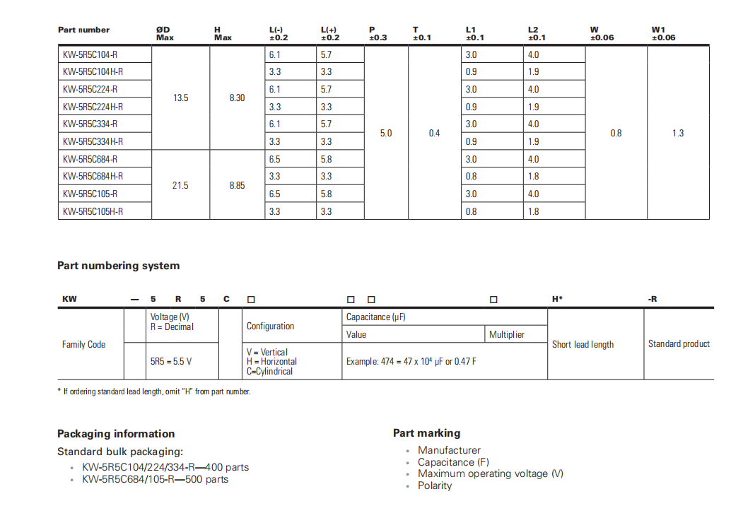 KW系列超級電容 KW-5R5C104-R KW-5R5C104H-R KW-5R5C105-R KW-5R5C105H-R KW-5R5C224H-R KW-5R5C224-R KW-5R5C334H-R KW-5R5C334-R KW-5R5C684H-R KW-5R5C684-R