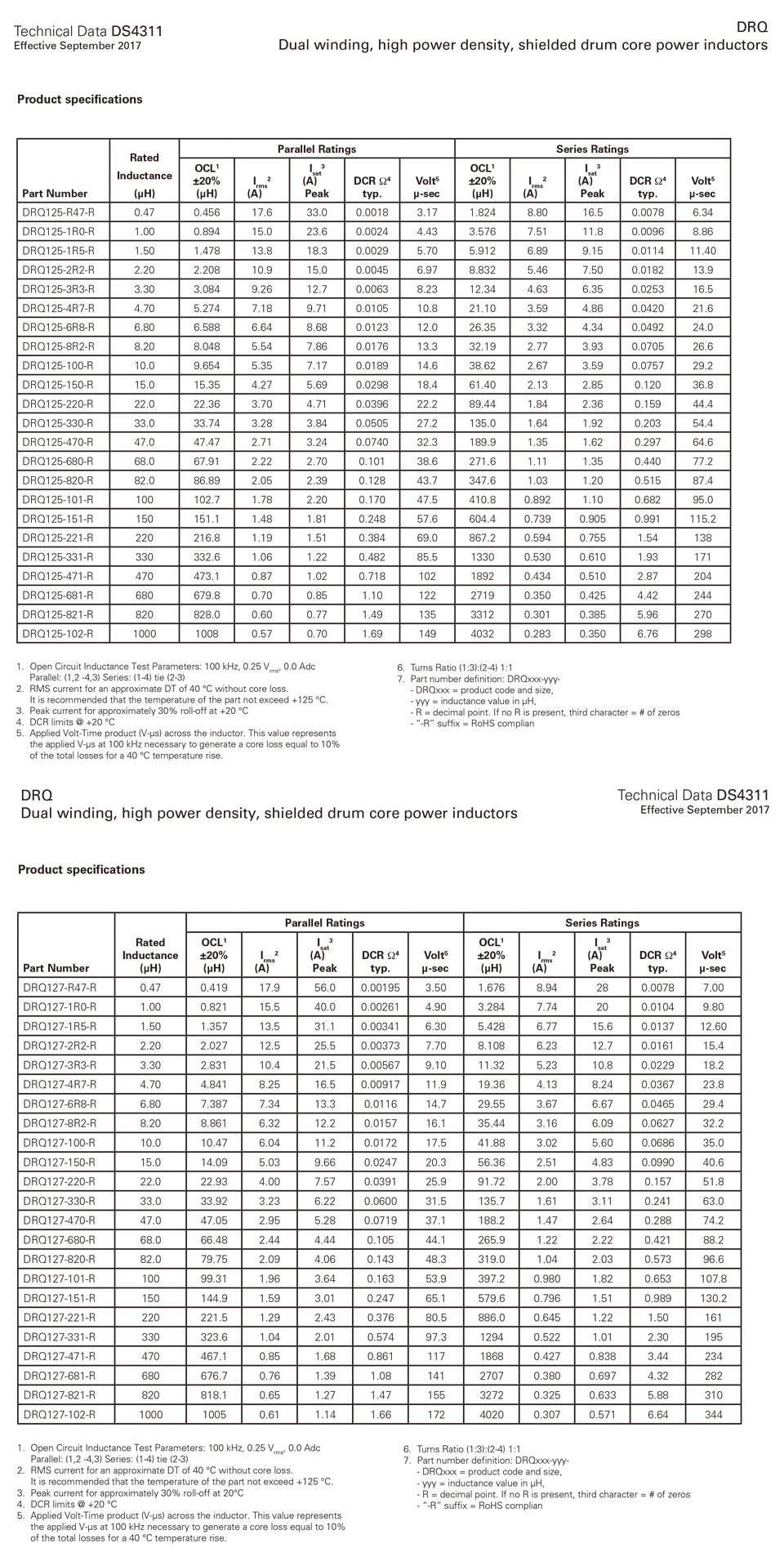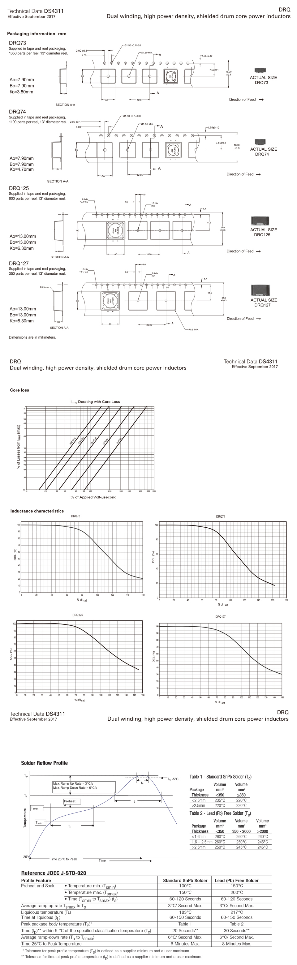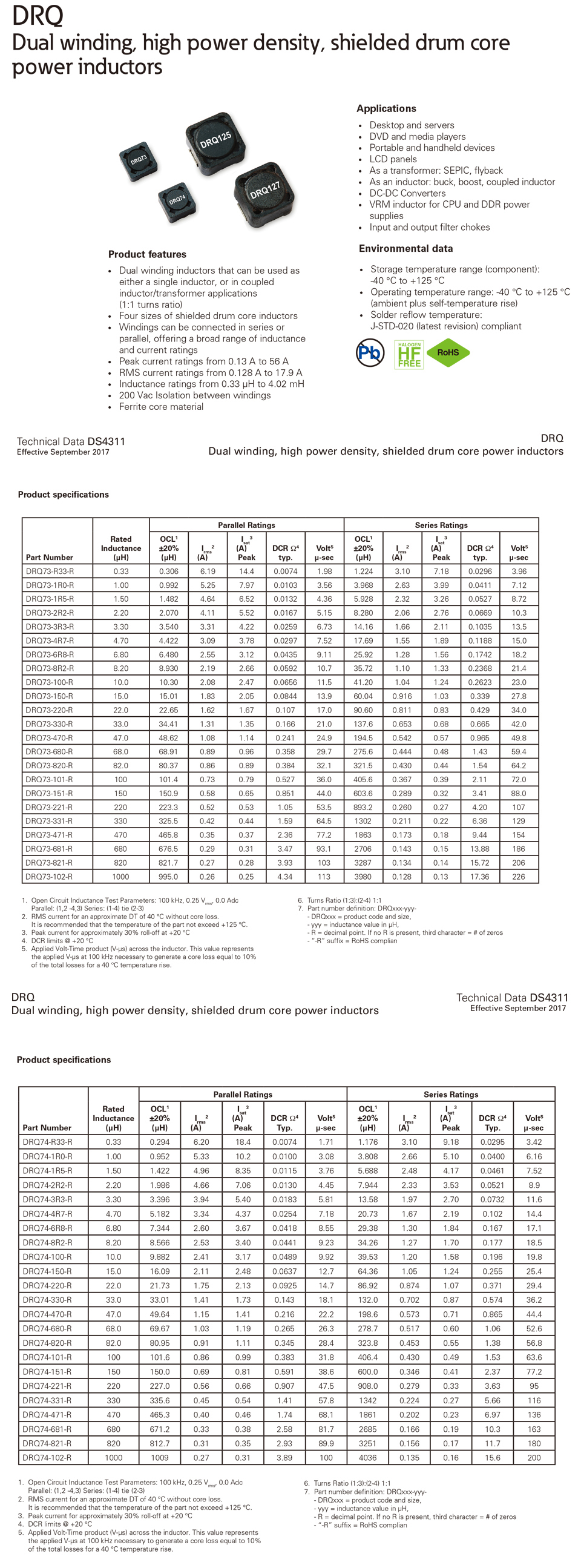 SMD 雙繞組屏蔽式功率電感器 - DRQ 系列,DRQ 系列雙繞組電感器,用于單電感器或耦合電感器應(yīng)用(1:1 匝數(shù)比)。 DRQ 電感器提供多種電感和電流額定值,因為它們可串聯(lián)或并聯(lián)連接。 設(shè)計采用具有 125&deg;C 最高工作溫度的鐵氧體磁芯 DRQ 系列。DRQ 系列的應(yīng)用包括:用作變壓器 - SEPIC、回掃;用作電感器 - 降壓、升壓耦合;直流-直流轉(zhuǎn)換器;VRM 電感器,用于 CPU 和 DDR 電源,輸入和輸出濾波器扼流圈
