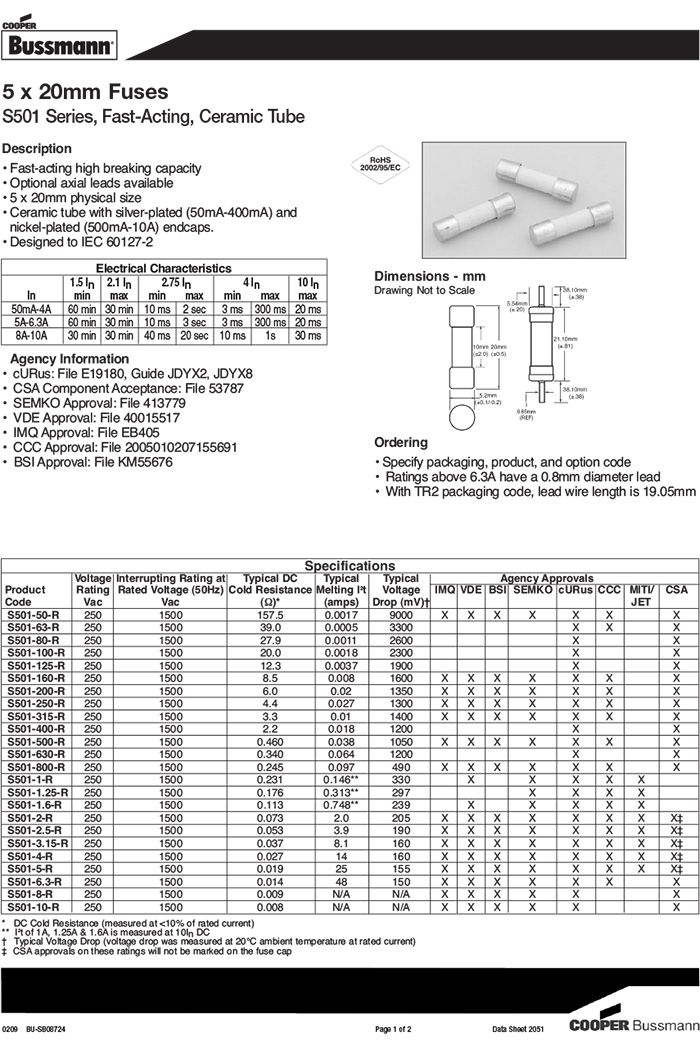 Bussmann S501系列 陶瓷保險絲 S501-400-R S501-1.6-R S501-100-R S501-1.25-R S501-160-R S501-1-R S501-10-R S501-125-R S501-6.3-R S501-500-R S501-50-R S501-80-R S501-630-R S501-63-R S501-5-R S501-2-R S501-2.5-R S501-200-R S501-800-R S501-4-R S501-3.15-R S501-315-R S501-250-R S501-8-R