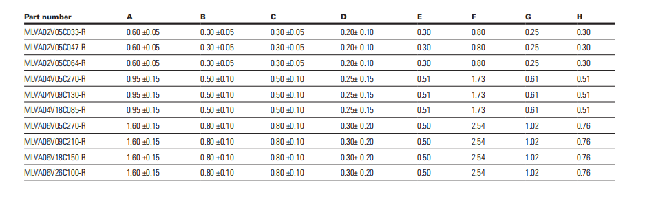 產(chǎn)品型號(hào):MLVA02V05C033-R,MLVA02V05C047-R,MLVA02V05C064-R,MLVA04V05C270-R,MLVA04V09C130-R,MLVA04V18C085-R,MLVA06V05C270-R,MLVA06V09C210-R,MLVA06V18C150-R,MLVA06V26C100-R