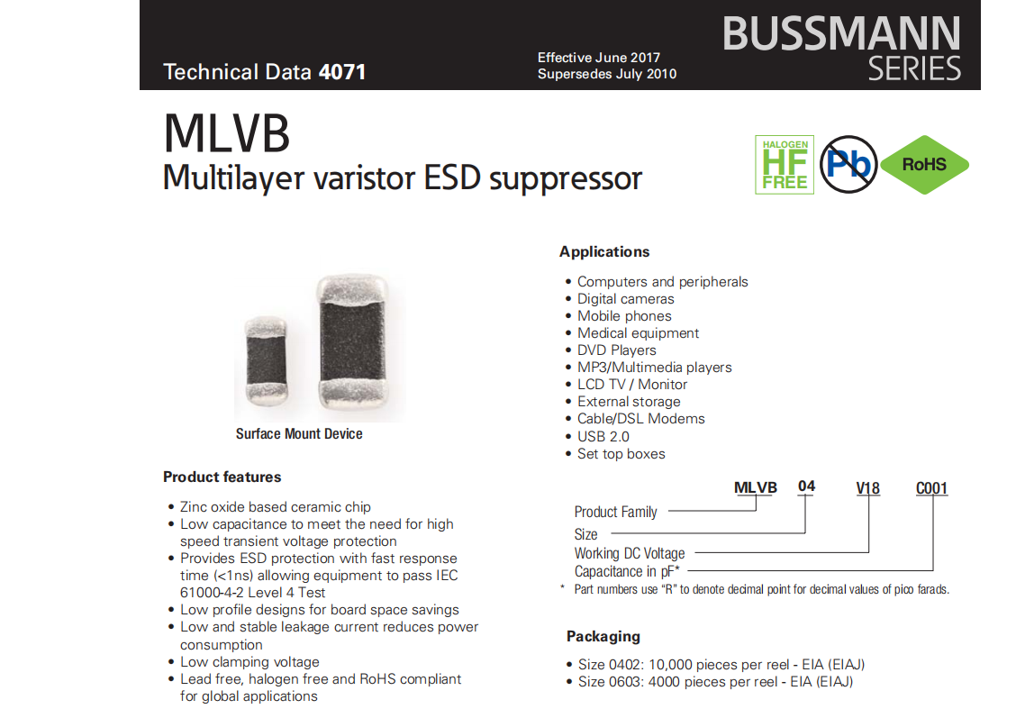 MLVB ESD靜電抑制器 MLVB06V18C001 MLVB06V18C0R5 MLVB06V09C005 MLVB06V18C003 MLVB04V18C001 MLVB04V18C0R5 MLVB04V09C005 MLVB04V18C003